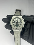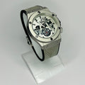 A statement of modern luxury, the Hublot Silver Skeleton Edition redefines elegance with its futuristic open-work dial and precision detailing. The polished silver case, paired with a grey patterned strap, creates a perfect fusion of innovation and sophistication. Its skeleton movement view reflects fine craftsmanship, making it an ideal choice for those who demand bold style with premium finishing.