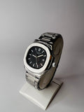 This is a luxury wristwatch featuring a stainless steel bracelet and case. The watch dial is Black with horizontal lines and silver hour markers, and it includes a date window at the 3 o'clock position. The brand name Patek Philippe is printed on the upper half of the dial. The watch has a polished metal bezel and a sleek, elegant design reminiscent of the Patek Philippe Nautilus series. It is displayed on a black cushion for presentation.