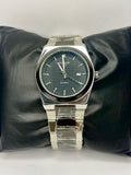 This is a Tissot-style quartz watch with a silver & Black metal case and band. It has a black textured dial, silver hour markers, and a date window at 3 o’clock. The watch runs on a quartz movement and has a clean, modern look.