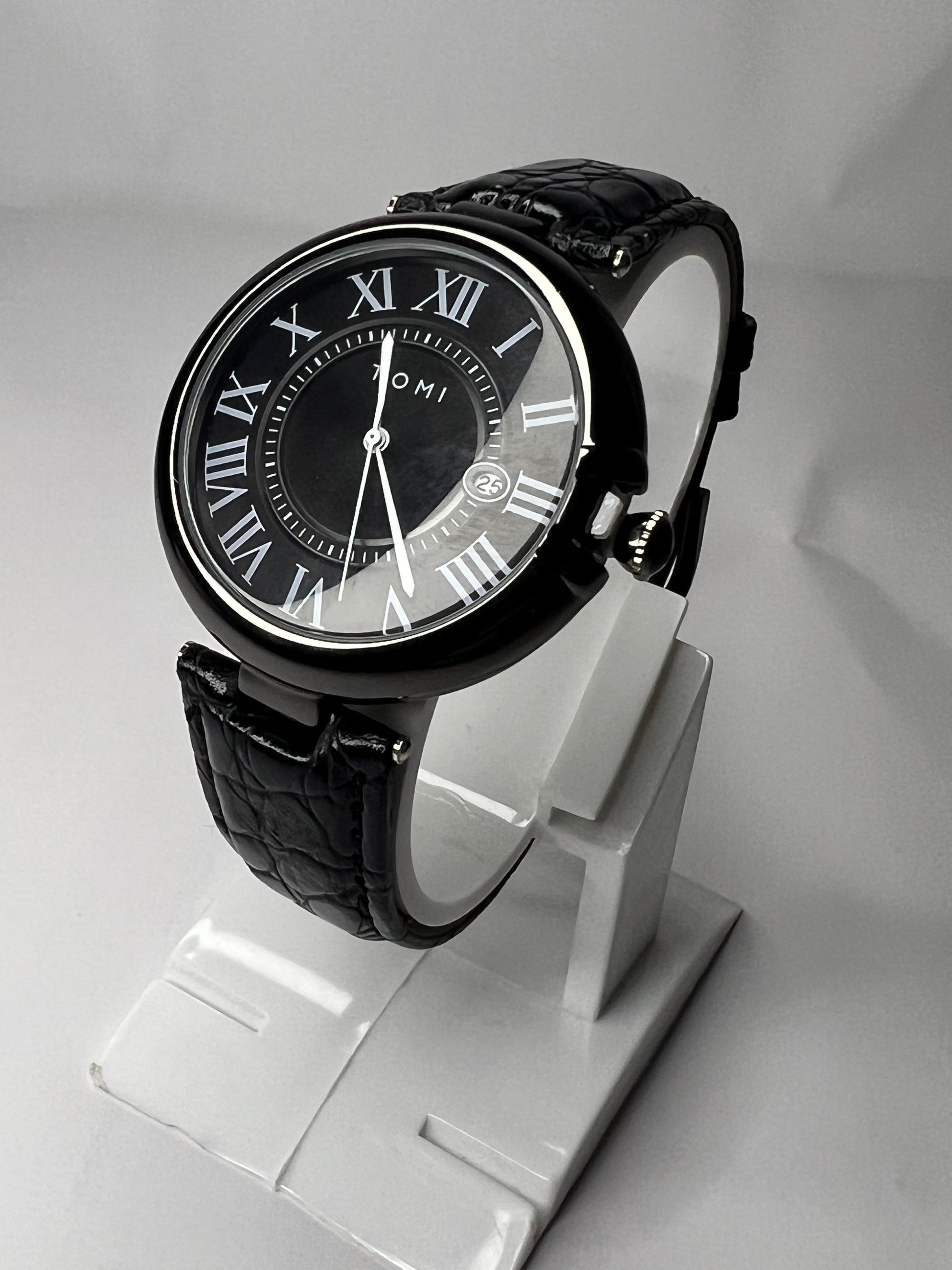 TOMI Roman Black Leather Strap | Black Dial