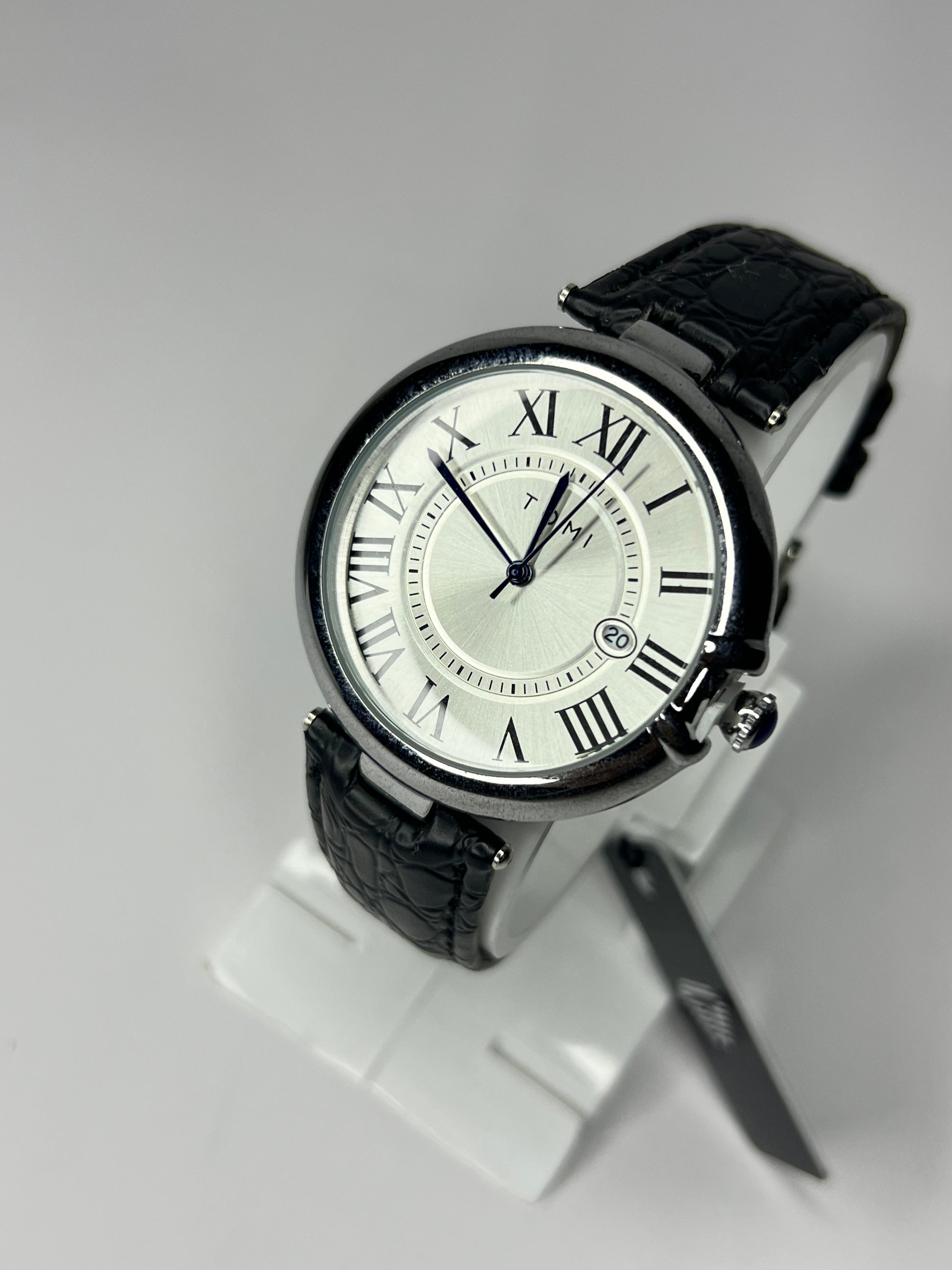 Refined and regal, the TOMI Roman Classic Leather Strap Watch is the embodiment of timeless elegance. Encased in a polished black body with bold Roman numeral hour markers, this watch channels vintage charm with a modern twist. The detailed silver-tone dial and deep blue hands create a striking contrast, while the textured black leather strap ensures both comfort and sophistication. Featuring a subtle date window and signature crown accent, TOMI brings “Elegance in Motion” to your wrist—perfect for those who appreciate classic design with contemporary finesse.